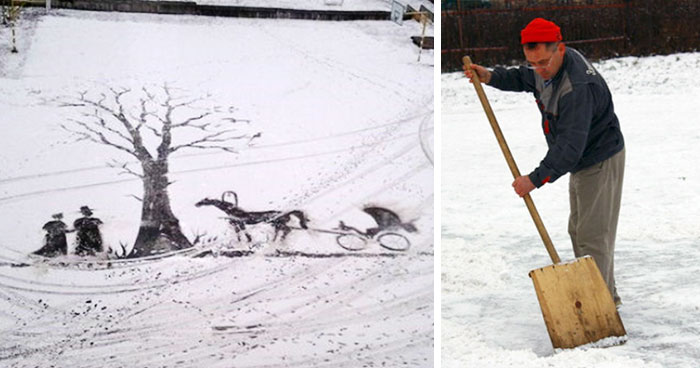 Semen Bukharin is not only the janitor at the school he works in, but also an artist. His paintings are unique and short-lived: he paints them with a broom or a shovel on snow. “Ideas for paintings appear spontaneous, sometimes children themselves have expressed wishes what they want to see”, – says the artist.