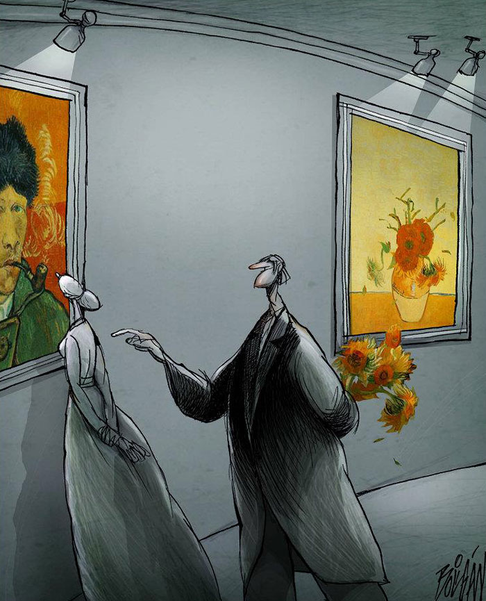 Each unique artwork bears a deep and powerful meaning. Don’t just take our word for it – Boligan has received more than 130 international awards for his work. Perhaps the most impressive thing about his drawing ideas is that, no matter how diverse the subject matter, they always seem to hit hard. Although he often takes on on social problems like consumerism, corruption, and hypocrisy, he has no problem transcending the public political topics traditionally handled by artists and take on social and emotional issues like loneliness, vanity, and despair, which are more often handled by the fine arts and literature.