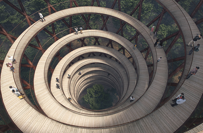 The centerpiece of the construction is set to be a winding observation tower, topping out at about 150 feet (45 metres). The hourglass-like construction should rise in a luscious preserved forest an hour south of Copenhagen, in Glisselfeld Kloster, Haslev. It consists of a 2000 ft. (600m) internal ramp, which will take visitors from the forest floor, through the treetops culminating with a 360° view of the hilly landscape, characteristic for the region.