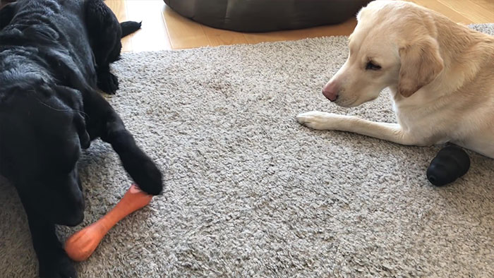 Olive (left) is seen chewing the orange bone that Mabel (right) is obviously craving with her focused stare