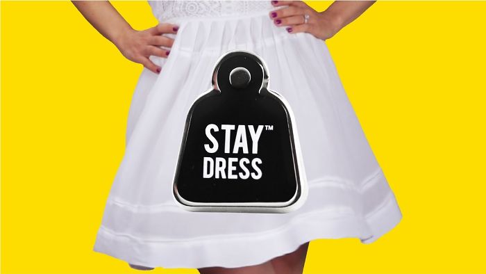 We think people are ‘cheeky enough’, so we designed ‘Stay Dress’: a set of 4 wearable, reusable and weighted pins to help keep dresses down on windy days!