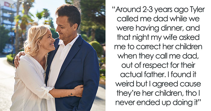 She told the poster to correct the children if they ever did it again, out of respect for their real father. Although he found this weird, her husband agreed, but soon forgot about it completely. However, the issue popped up again when they went to pick up Tyler, and his piano teacher called OP his dad. He said that he was, but his wife immediately cut in and clarified that he’s the stepdad.