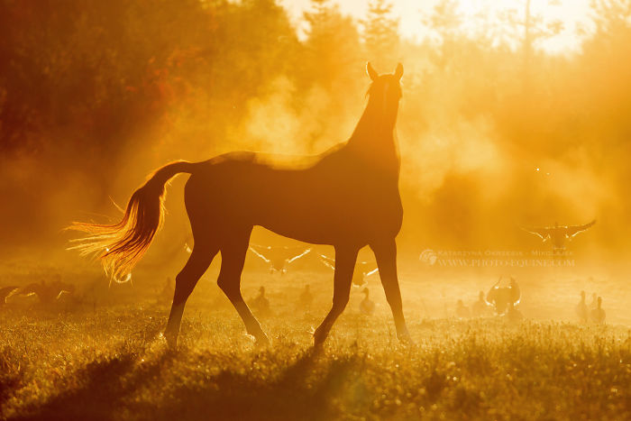 A big drop in the temperature through the night allowed for the creation of fog to gather around the surrounding pouds, just as I had hoped for. Right after 7:00 am, the sun rose above the wall of forest beyond the paddocks, which provided the most beautiful backlighting, and the perfectly exposed background. We walked with our model, a young stallion, to chosen field where we noticed a large flock of wild ducks casually gathered in the grass. At that moment, I already had my desired image in my head!