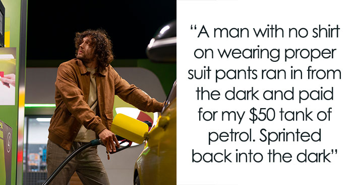 Less crazy than the other stories on this thread but one time I was at the servo filling my car up at night time and there was a hospital across the road. a man with no shirt on wearing proper suit pants and formal leather shoes ran from the dark across the road into the servo. he was in there for 5 minutes then sprinted back into the dark. i walk in to pay for my petrol and the guy serving tells me that the random guy in the suit pants payed for my $50 tank of petrol … i had so many questions.