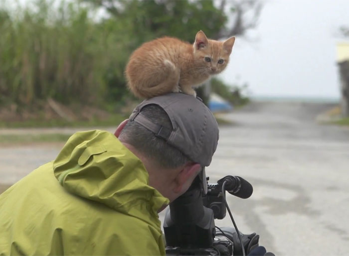 This adorable orange kitten tried to interrupt Japanese photographer and filmmaker Mitsuaki Iwago’s filming session. Iwago was shooting a special about cats of the world for television company NHK on Okinawa island when this little feline wandered away from his mother. Soon, the tiny stray had made itself comfortable on the long-time filmmaker and cat-lover. In a talk at the Kawasaki City Museum, Iwago explained how he finds his subjects: