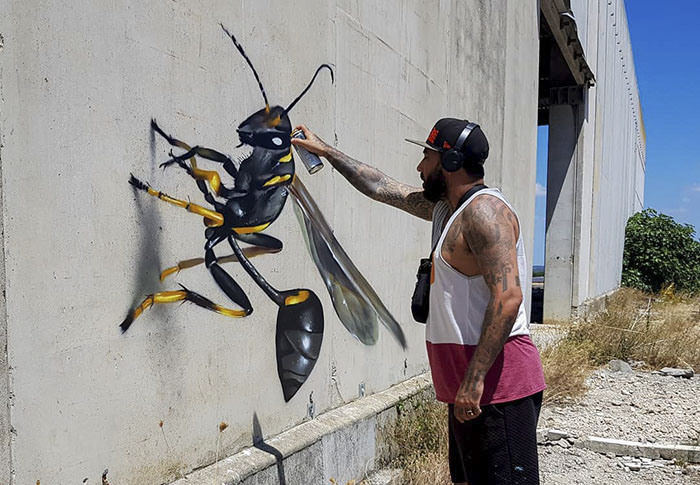 The Portuguese artist started creating realistic art in the ’90s when it was first gaining prominence in the country. He started with simple sketches on street walls and train tracks but then advanced into large-scale 3D drawings. Odeith continued to evolve and adopted the obscure signature style, which he refers to as “sombre 3D.” This technique combines angles, lines, and shadows to create an extraordinary 3D art effect. In 2005 he gained international recognition for his anamorphic art series and realistic drawings, which looked like something out of a science horror fiction flick, with giant spiders appearing to climb off the walls at helpless passers-by.