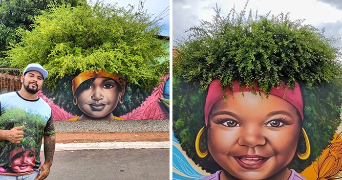 Luckily, a Brazilian artist, Fábio Gomes Trindade, doesn’t lack in this department and came up with a genius idea to mix urbanism and nature in his black representation murals. For his portraits, Fábio chooses blank walls under trees which could represent people’s hair.