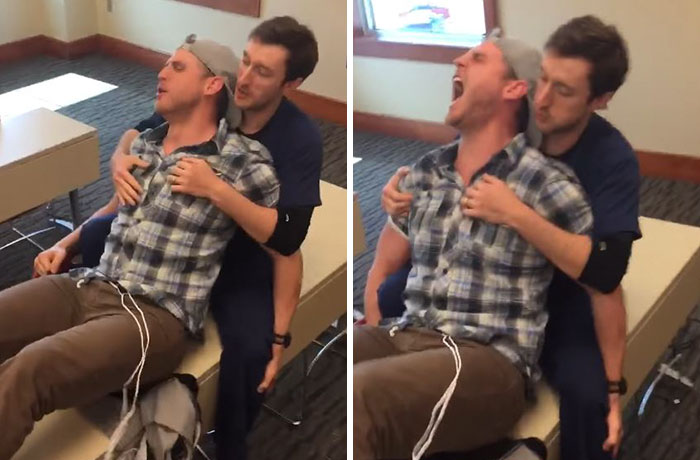 The man writhing in agony is Johnny Wade, a Lincoln Memorial University Student who bravely volunteered to be hooked up to a machine that emulates the pain experienced by women during childbirth. With his friends filming him and another friend holding him, Johnny, who’s training to be a nurse anesthetist, managed a mere 20 seconds before tapping out. Still, it looks like they were quite possibly the most traumatic 20 seconds of his life. It’s just a good job the survival of the human race isn’t dependent on men giving birth, because if it was, it looks like we’d soon be extinct.