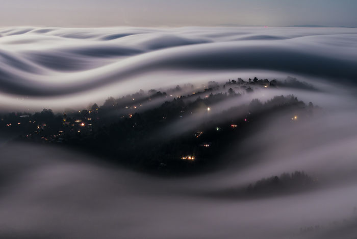 Italian photographer Lorenzo Montezemolo climbed Mt. Tamalpais to capture Marin County, California covered with a river of fog lit by a full moon. He later wrote that he had “compressed 186 seconds of moonlit fog into an instant.”