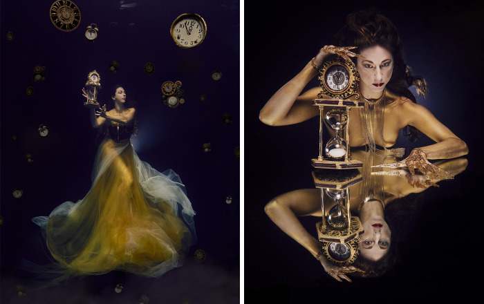 Flying half way around the world, with a bag full of props, costumes, and a custom built clock sculpture by the incredible artist Noah McKinley – all to join underwater photographer Jose Cano for a photoshoot in New Zealand really meant the pressure was on. And in line with the theme of the shoot, it was a mad dash every day against the clock to capture the shot before the pool was filled with gold particles from my body and hair paint and before the compounding complexities of a 20 pound skirt, underwater mirrors, finger props, and clock sculptures, just got the better of us.