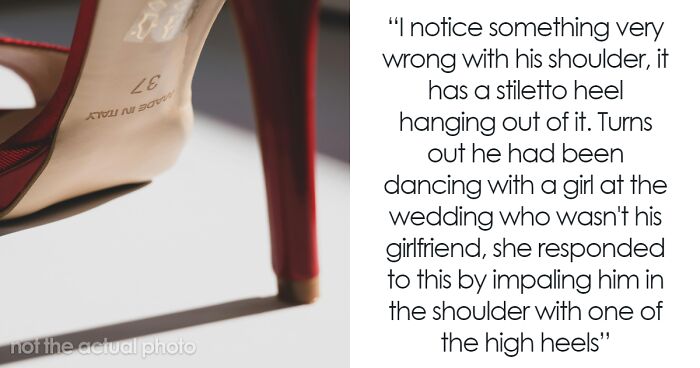 It’s only at this point that I notice something very wrong with his shoulder, it has a stiletto heel hanging out of it. Turns out he had been dancing with a girl at the wedding who wasn’t his girlfriend, she responded to this by impaling him in the shoulder with one of the high heels she was carrying around.