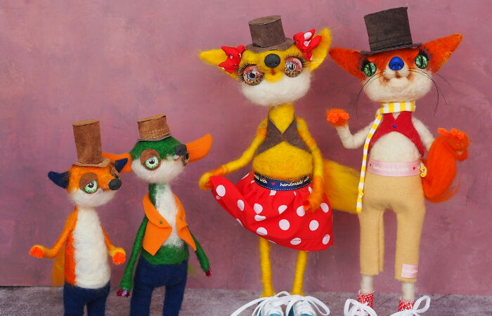 My foxes are the most bizarre in the world. They are one-of-a-kind characters that tell stories. They are colorful, smiling, and thoughtful, living in their fairy families.