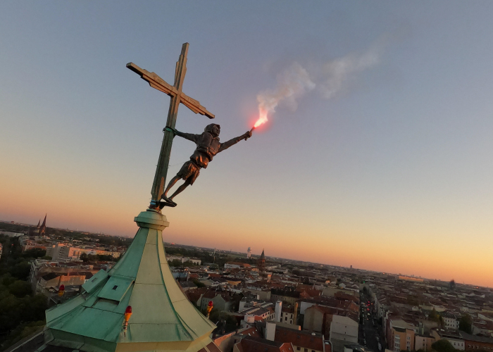 Attentive passers-by in Blücherplatz in Berlin’s Kreuzberg district may well notice that something’s up. Up on the dome of the Neo-Gothic Holy Cross Church, to be precise. Clinging onto the huge cross with one hand and holding a smoking flare in the other, a little boy wearing a life jacket is calling for help.
