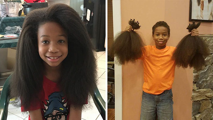 And as you can see from the pictures below, the kid grew a pretty impressive amount of hair! In fact, by the time he was done with his heartwarming project, Thomas, from Maryland, had enough hair to make three wigs! After he’d cut it all off, his aunt, Amber Ray, posted a before-and-after picture on Twitter, and it’s since been shared more than 57k times and liked by more than 110k people who are no doubt as amazed by this awesome kid as we are.