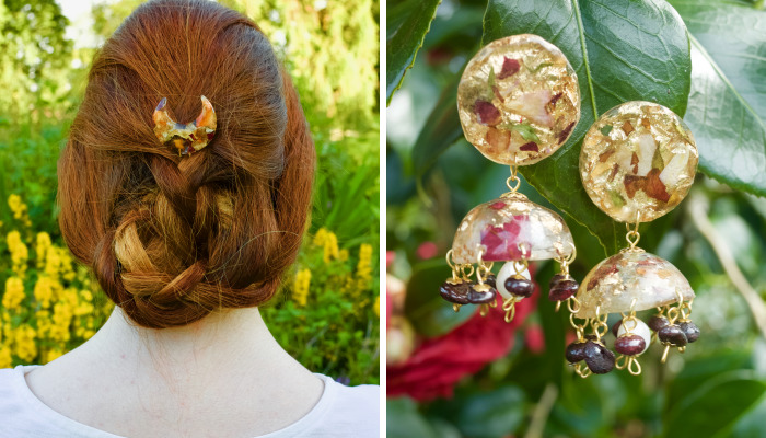 I have a unique style: I combine various real flowers (dried and pressed) with gorgeous semi-precious gemstones and pearls, creating pieces which are reminiscent of the elegance of French Art Nouveau and the extravagance of Persian and Indian bridal jewelry.