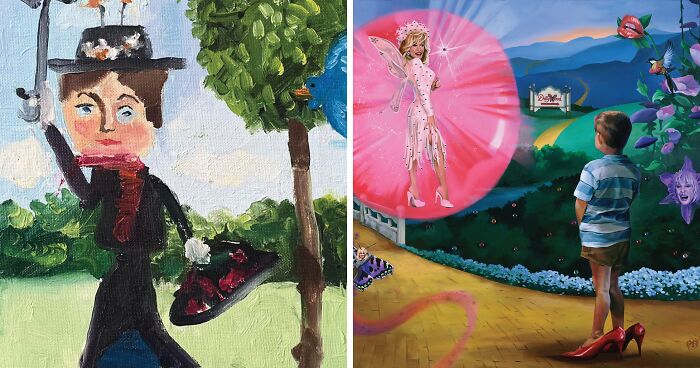 “The Dollypop Guild was painted for an exhibit at World of Wonder Gallery called Dollypop, with works by numerous artists inspired by Dolly Parton. I based mine on the scene from ‘The Wizard of Oz’ when Dorothy meets Glinda—only we’re not in Kansas anymore, Toto! Dorothy’s replaced by a young boy (wearing an oversized pair of red stilettos, of course) who is watching his idol, Dolly Parton, descend in a big, pink bubble to welcome him to Dollywood! I really enjoyed the opportunity to weave together my own personal narrative with cultural references from the past and present.”