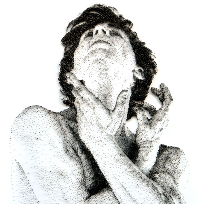 I translate my ideas onto large white wooden panels by hammering the nails at varying heights and distances to create the tone and texture. The majority of my ‘nail sculptures’ are representations of the human form. My figurative interest is in the lines we create. It was only natural I would move towards seeking out dancers whose ability to strike beautiful poses was exactly what I was trying to capture.
