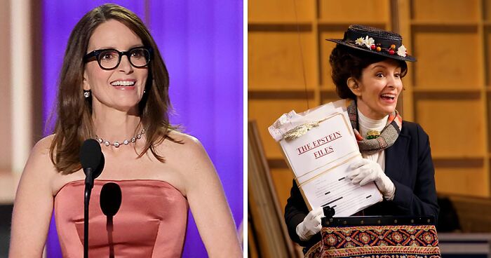 One of the props Fey pulled out was a massive file titled “The Epstein Files”