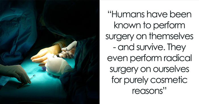 Humans have been known to perform surgery on themselves – and survive. Thanks to their extreme heartiness, they regard as routine medical procedures what most other species would regard as inventive forms of murder. Humans even perform radical surgery on ourselves for purely cosmetic reasons.