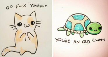 These are rough sketchbook doodles I did of cute greeting card style illustrations. With offensive words in my handwriting. The idea was to get some feedback