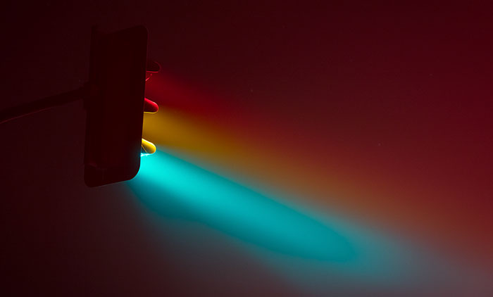 “The possibility that the light colors are “visible” in fog fascinates me,” Zimmermann said. “The unknown hue of blueish light is like the fog-hidden for the human eye, but the photograph shows us things we otherwise overlook, such as a simple traffic light on the street. An all known object which produces a strong effect in a strange situation with a simple photographic setup.”