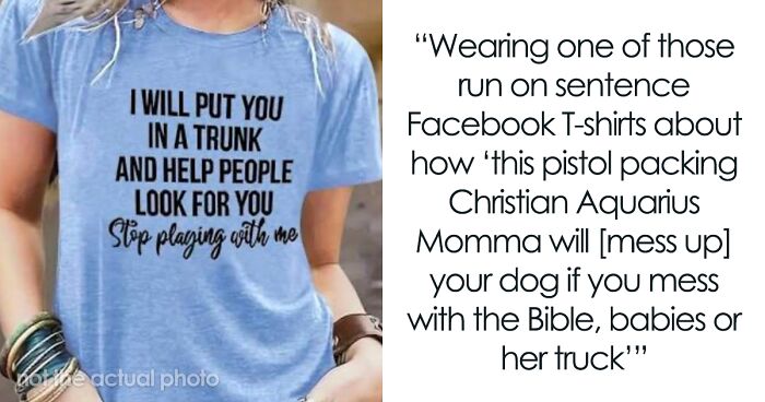 Wearing one of those run on sentence Facebook T-shirts about how ‘this pistol packing Christian Aquarius Momma will butt f**k your dog if you mess with the Bible, babies or her truck’