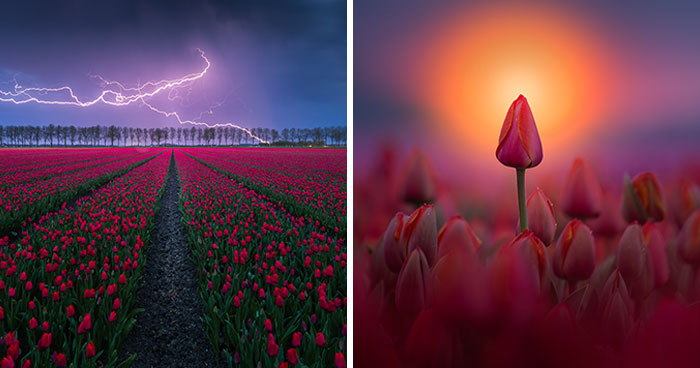 This year, I spent the whole tulip season in my homeland and captured a big variety of tulip photos: From storms and lightning strikes to lots of drone shots and beautiful misty mornings.