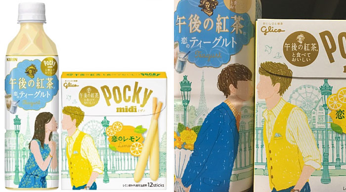 Kirin, a beverage company behind many of Japan’s favorite drinks, and Glico, the maker of snacks and chocolate, have joined forces in their marketing campaigns to bring you products that interact with each other. The products in question? Lemon-flavored Pocky and “teagurt”-flavored tea (yes, that’s a thing). Some of the food packaging characters kiss. Others give flowers or cakes to each other. But all of them get along in some way or another. Perhaps us humans can learn from this packaging design example!