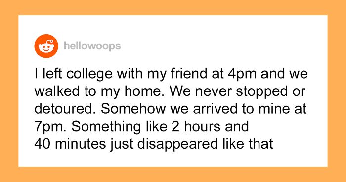 Me and my friend were walking back home after college, along the same route I always took every day. It was a 20 minute walk, some of which was a country lane. I left college with my friend at 4pm and we walked to my home. We never stopped or detoured. Somehow we arrived to mine at 7pm. Something like 2 hours and 40 minutes just disappeared like that.