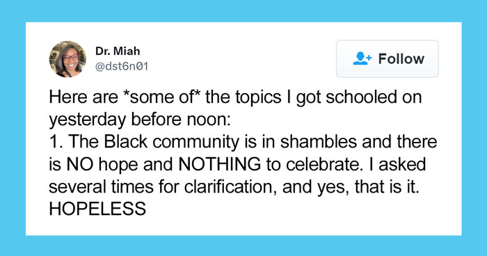 Dr. Miah starts with this man’s approach to the situation of the black community today. After the long way this community had to go through, with people like Martin Luther King Jr., Maya Angelou, and so many others finding the strength to move forward, this man didn’t seem to recognize any achievements or improvements in the situation. The woman emphasizes this man’s approach had no optimism at all: “The Black community is in shambles and there is no hope and nothing to celebrate.”