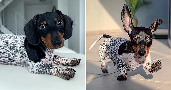 Meet Moo – just about the cutest seven-month-old dachshund whose fur is adorably mismatched. Dark brown and black on his head, and white with black spots on the rest of his body, Moo’s fur pattern definitely makes passersby and social media lurkers look twice to make sure he isn’t wearing doggy pajamas.
