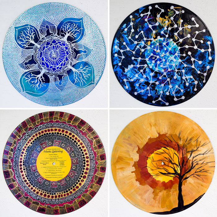 Sara Roizen paints impermanence on vinyl records. The master of art therapy graduate uses “acrylic paint, stencils, gels, paint pens, ink, colored pencil, and more” to create colorful mandalas on these dated discs.