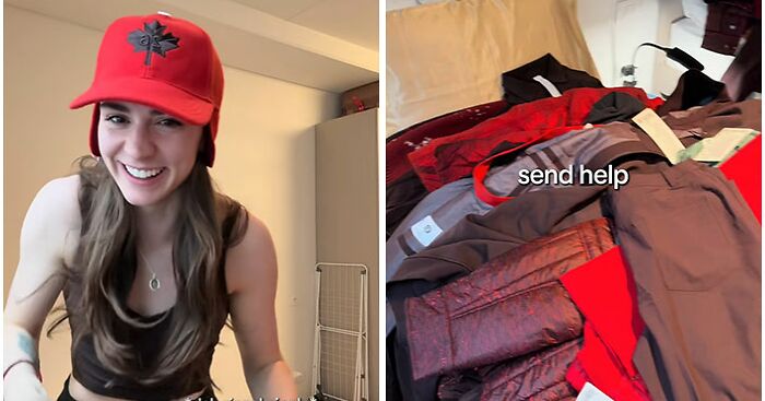 She then revealed a parka and a red winter jacket detailed with Canadian flag and maple leaf patches, briefly lifting one of the fitted tops while laughing.