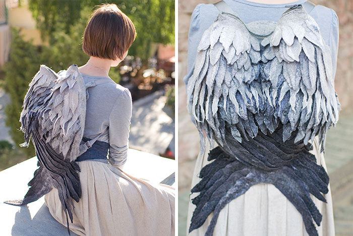 To make this dream a reality, we have created a backpack that look like wings. It is made of felted wool (felt), that is very durable, comfortable and looks great. Each backpack-wings has a zipper and lining with pockets inside. The straps are strengthened and can be adjusted.