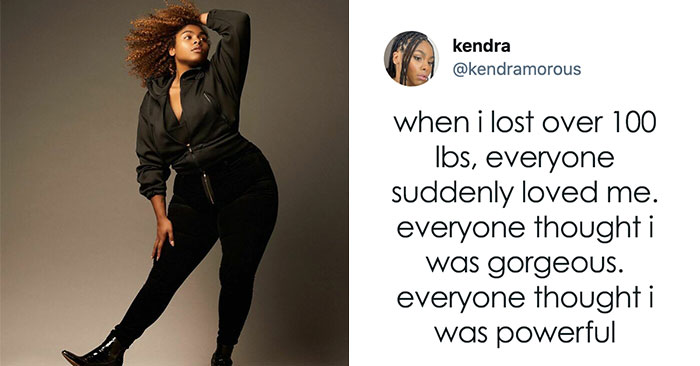 A curve model, activist, and content creator, Kendra Austin, shared a Twitter post that highlighted how after she lost 100lbs, people congratulated her and treated her differently, which seemed like a confirmation that being thin is being more valuable to the world. Kendra ignited a discussion online about what it’s actually like to lose weight and what consequences come with it.
