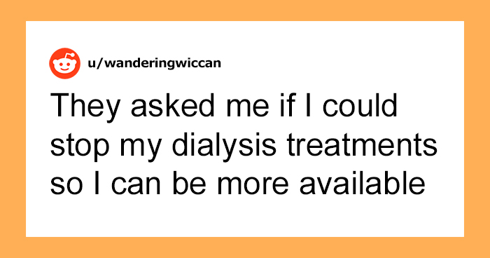 They asked me if I could stop my dialysis treatments so I can be more available. Yeah Karen, let me just die for less than 15 an hour.