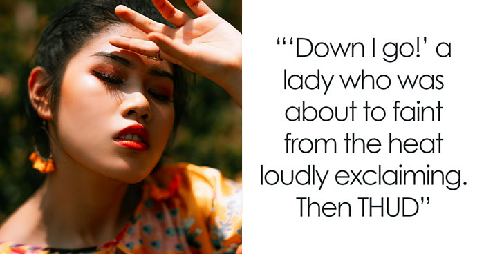 “Down I go!” a lady who was about to faint from the heat loudly exclaiming. Then THUD.
