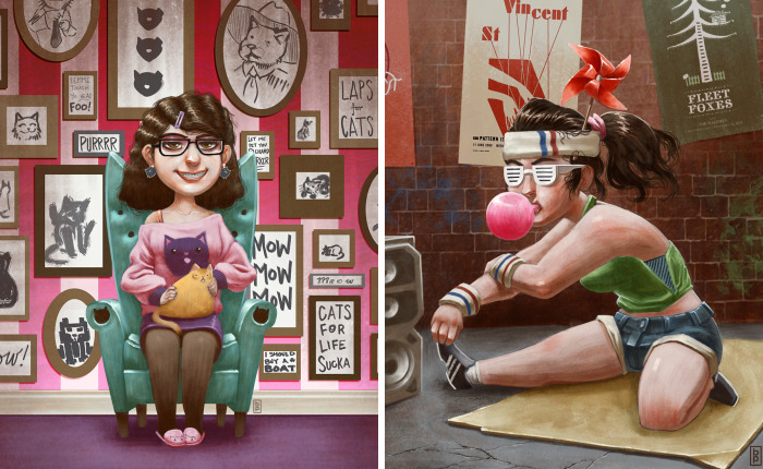 I painted these images in February as a birthday present for her. I wanted to give myself a monthly challenge, something I’d never done before. I used three programs: Adobe Photoshop and Illustrator CS6 and Clip Studio Paint. I’d create the sketch in Clip Studio (for the smooth, buttery lines) and do the actual painting in Photoshop. Illustrator came in whenever there was any text or patterns.