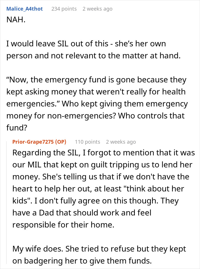 And the cherry on this financial disaster sundae? The OP’s wife has spent years supporting her parents, but when it comes to inheritance time, everything is going to her sister. Yep, no thank-you, no reimbursement. Nothing. And let’s not forget about the “emergency fund” the OP set up for his in-laws. But instead of saving it for actual emergencies, they drained it faster than a teenager’s phone battery on TikTok.