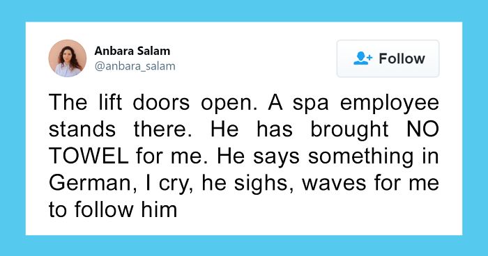 And that’s a well-needed shot of laughter from a woman named Anbara Salam. The British-Arab writer shared an episode from the most embarrassing moment of her life with a few unlikely variables—a German sauna, a lobster, a fire escape, and the naked protagonist herself.