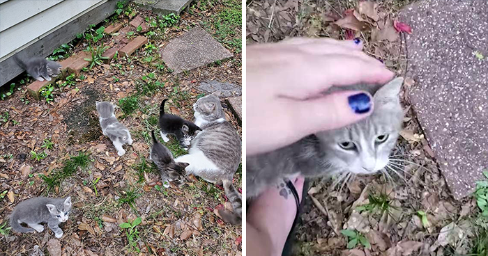 The kittens were too scared to come to meet her at first, but after some reassurance by their mommy, they came out of their hiding. “One of the little gray ones was super brave and came up to me with his little pointy tail held up high in the air and let me pet him immediately,” Prior said. “Eventually, after about 10 to 15 minutes, they had all come up to me and let me hold them and pet them.”