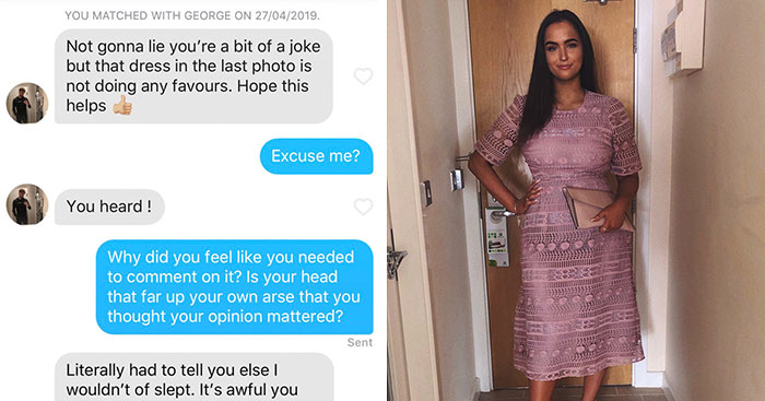 Just last year, Thea Chippendale had an unfortunate run-in with a man on the app, who offered the woman some unsolicited “advice”. “Not gonna lie you’re a bit of a joke but that dress in the last photo is not doing any favours. Hope this helps,” wrote George, finishing off his sentence with a thumbs-up emoji. Of all things the man could’ve said, he decided to criticize the dress Thea was wearing in one of the photos.
