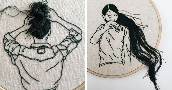 Using unique embroidery patterns, hoops, and a black thread as a substitute for her subject’s long locks, Liam’s embroidery ideas feature women with flowing locks of hair. Sometimes, she even features locks of hair gracefully flowing out of the embroidery hoop, adding a three-dimensional touch to the beautiful artwork. From French braids to messy buns to long ponytails – each work of art features a different hairstyle that cascades on the canvas in the most graceful way. Keep on scrolling to check her unique artworks out!