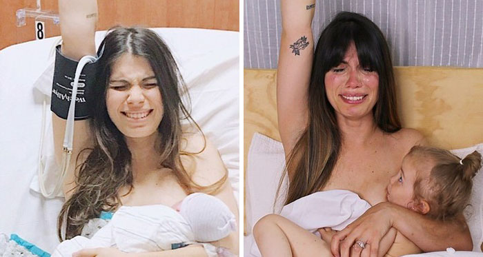 “The first and last time my precious Hazel ever nursed. I didn’t know that one person could feel so proud and so broken at the same time, right now I am a hormonal, emotional, and mental mess. Raising my arm in this picture was very difficult for me as I had to fight through uncontrollable tears: this picture meant that I would never breastfeed my Hazel ever again. I have been nursing for so long, that I don’t know what it’s like to not nurse anymore. As I looked behind the camera, Tim is crying like I had never seen him cry before, like seriously, a deep gut cry. I was her comfort, her safe place, and I hope she still finds me that way. A month shy of 2 years old, she finally has a bed in a shared bedroom with her sister. We bought Hazel her first bed, used any distraction we could come up with, snacks and new toys to keep her mind off of it. Tim has taken over bedtime completely, including all nighttime wakings. We are on our third day, and every day gets a little bit easier. The guilt I feel for not putting her to bed is so intense and I can’t wait to go back to it once she doesn’t ask to nurse anymore. Closing a chapter is painful, but I am hopeful that this new season of our lives will also be special in its own way. Through this maturation step she will not only grow more independent, but I will get a much needed break. She unlatched for the last time and sobbingly I said to Tim: ‘I did my best.’ He hugged me and responded with: ‘No. You did THE best, because you gave her your all.’ I love my family and am so thankful for such special and unforgettable moments like these. “