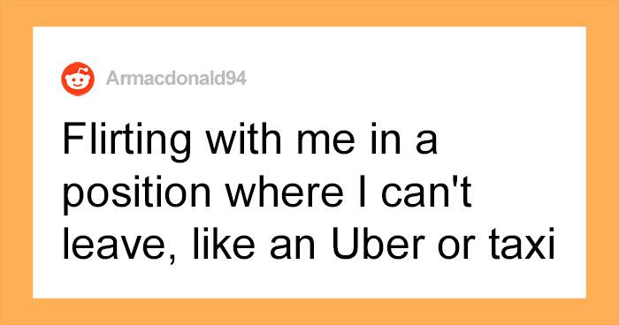 Flirting with me in a position where I can’t leave, like an Uber or taxi. Once I had an Uber driver flirt with me the entire ride late on a Friday night. I tried to stop responding, but he kept telling me how beautiful I am. Most times, when women aren’t interested and you keep pushing it, we get scared we’re gonna get assaulted or killed! It’s terrifying.