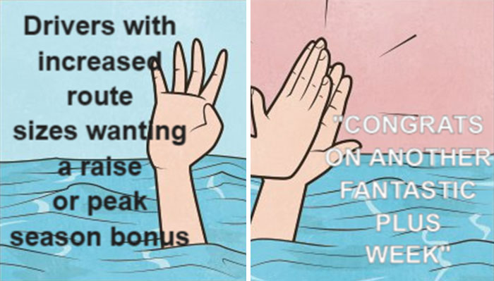 In Nick’s meme, the drowning hand symbolized the “drivers with increased route sizes, wanting a raise or peak season bonus” and the hand which doesn’t provide any kid of help symbolizes Amazon Homebase not doing anything to change the drivers’ situation but telling them “Congrats on another fantastic plus week.”