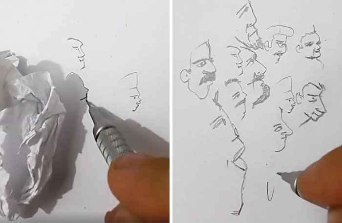 Turkish Electrical Engineer and Calligraphy Artist Tolga Girgin sketches by outlining the shadows of wrinkled paper. Turning the crumpled paper ball around, he fuels his imagination by bringing the many faces hiding in the shadows to life.