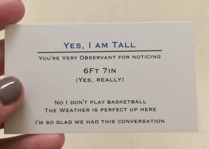 If you are tall and you’re always being bombarded with “how tall are you” type of questions, you can learn a lot from this 17-year-old! Logan, a 6′ 7″ (2,04 m) high-school senior from Holly Springs, bought 100 business cards for just 10$ that answer all these annoying questions right away.